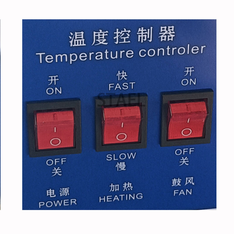 Den elektriske varmelegeme er installeret i boksen under studiet, opdelt i to grupper, det vil sige "høj temperatur og lav temperatur", og der er en indikatorlys, det grønne lys indikerer, at den elektriske varmeapparat fungerer, kassen opvarmes, og det røde lys indikerer, at opvarmning stopper.